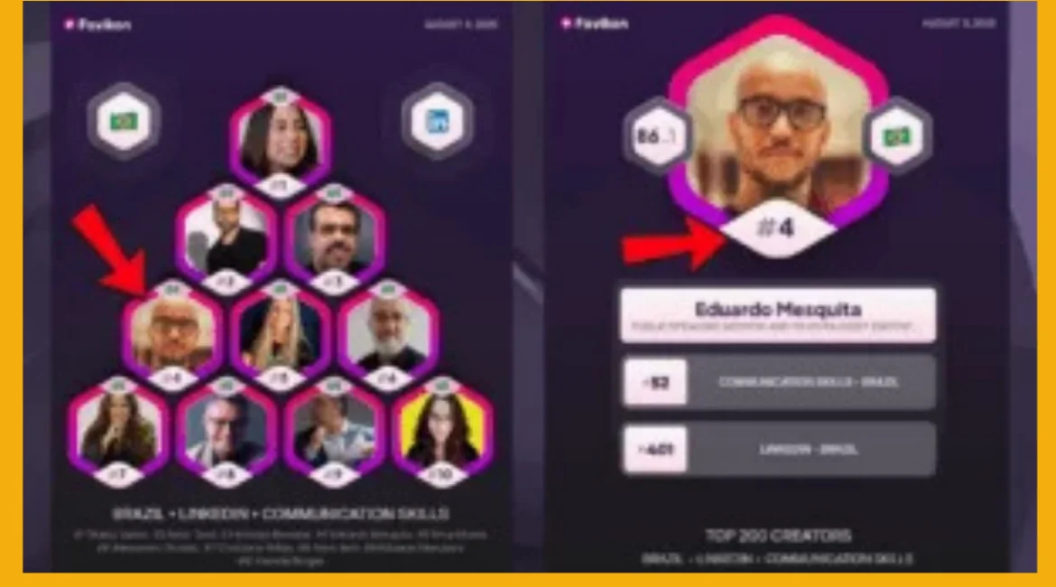 Recentemente, venho acompanhando minha evolução no ranking da Favikon, a maior plataforma mundial de análise de criadores. Saí da 9ª posição, passei pela 6ª e acabo de atingir o 4º lugar entre os maiores criadores de conteúdo do Brasil na categoria Comunicação.